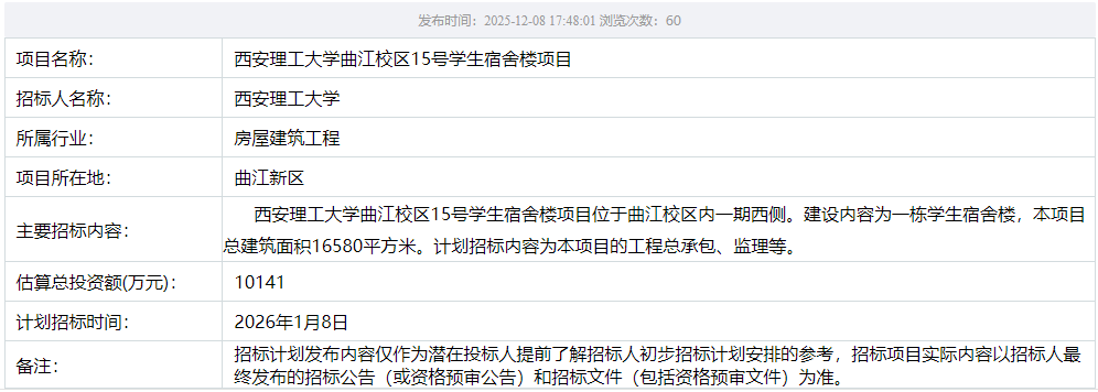 【宿舍楼项目】BEAT365英国官网曲江校区15号学生宿舍楼项目招标计划
