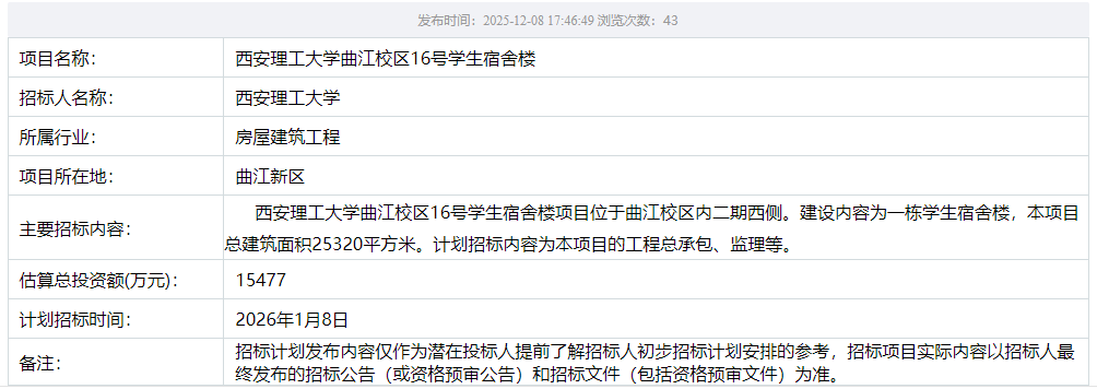 【宿舍楼项目】BEAT365英国官网曲江校区15号学生宿舍楼项目招标计划