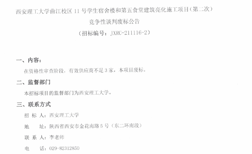 【亮化工程】BEAT365英国官网曲江校区11号学生宿舍楼和第五食堂建筑亮化施工项目(第二次)竞争性谈判废标公告