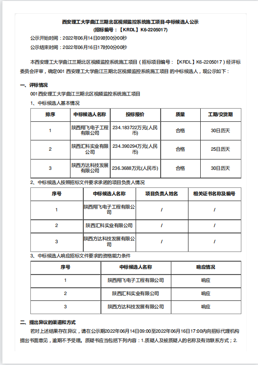 【监控系统】BEAT365英国官网曲江三期北区视频监控系统施工项目-中标候选人公示
