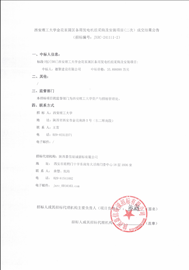 【发电机组采购及安装】BEAT365英国官网金花家属区备用发电机组采购及安装项目(二次)成交结果公告