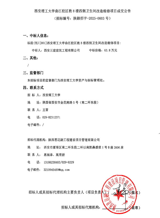 【改造维修】BEAT365英国官网曲江校区教8楼西侧卫生间改造维修项目成交公告