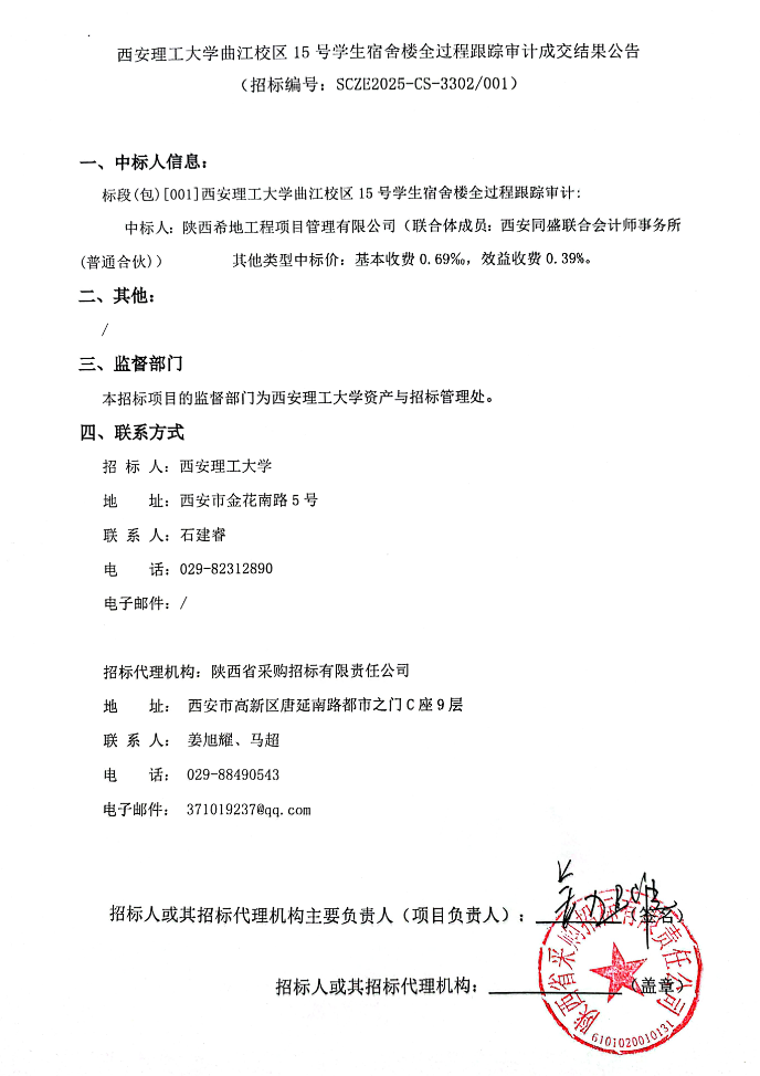【全过程审计】BEAT365英国官网曲江校区15号学生宿舍楼全过程跟踪审计成交结果公告