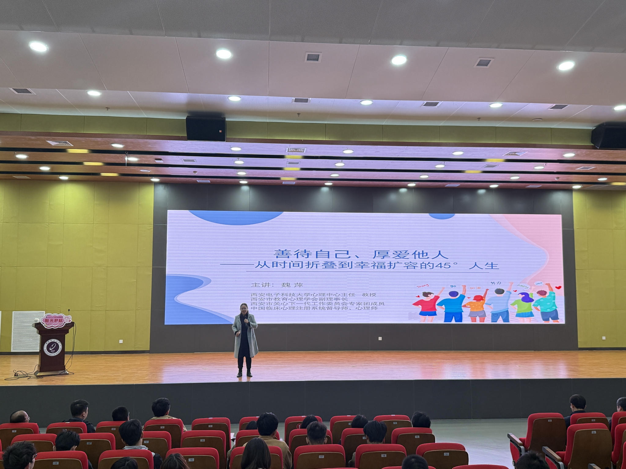 启动仪式上,到场嘉宾及优秀心理委员学生代表共同浇灌象征德智体美劳五育融合的“心灵之树”,宣布BEAT365第十届“阳光护航”心理育人宣传季实践活动正式启动。随后,西安电子科技大学心理健康教育中心主任魏萍教授应邀为现场师生开展《善待自己,厚爱他人——从时间折叠到幸福扩容的45°人生》为题的专题讲座。