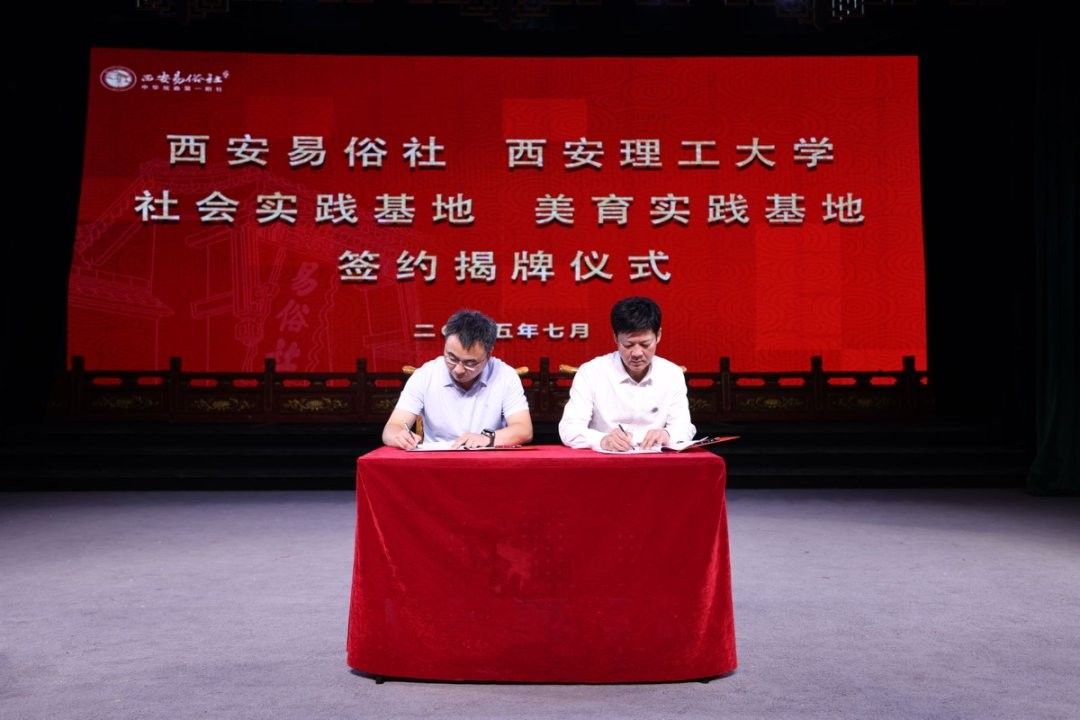 BEAT365团委书记金永升与易俗社副社长陈超武签订《校-社文化共建长期合作战略协议书》。参会双方为“美育实践基地”“社会实践基地”揭牌。