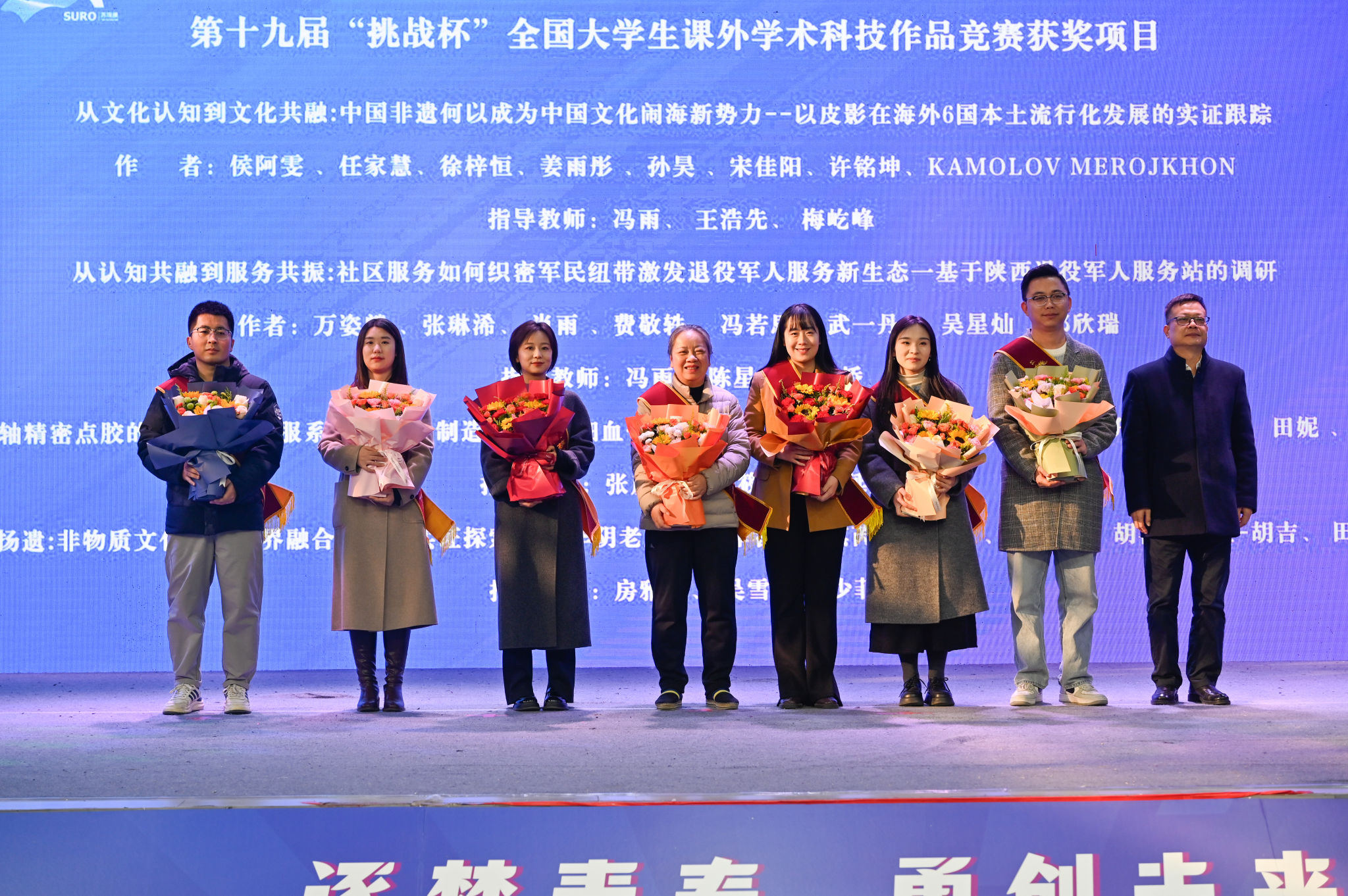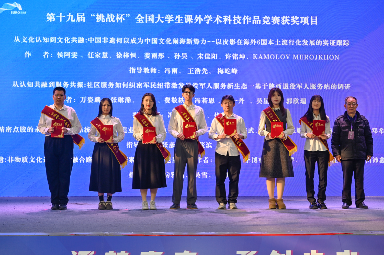 张存库与参会领导嘉宾共同启动第三十四届大学生课外学术科技作品竞赛并对第十九届“挑战杯”全国大学生课外学术科技作品竞赛获奖团队师生代表进行了表彰。会后,专家评委对参赛作品进行了分组问询与评审。