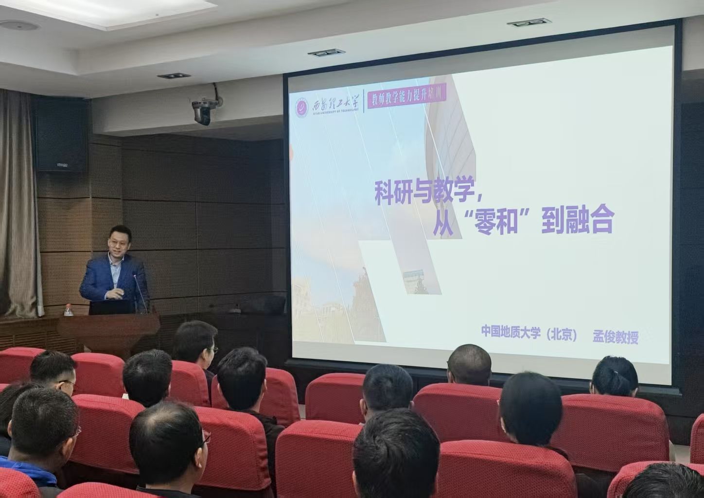 4 月12日下午,国家优秀青年基金获得者、第四届全国大学青年教师地质课程教学比赛特等奖获得者、中国地质大学(北京)孟俊教授在学科一号楼报告厅开讲《科研与教学,从 “零和” 到 “融合”》的专题报告。