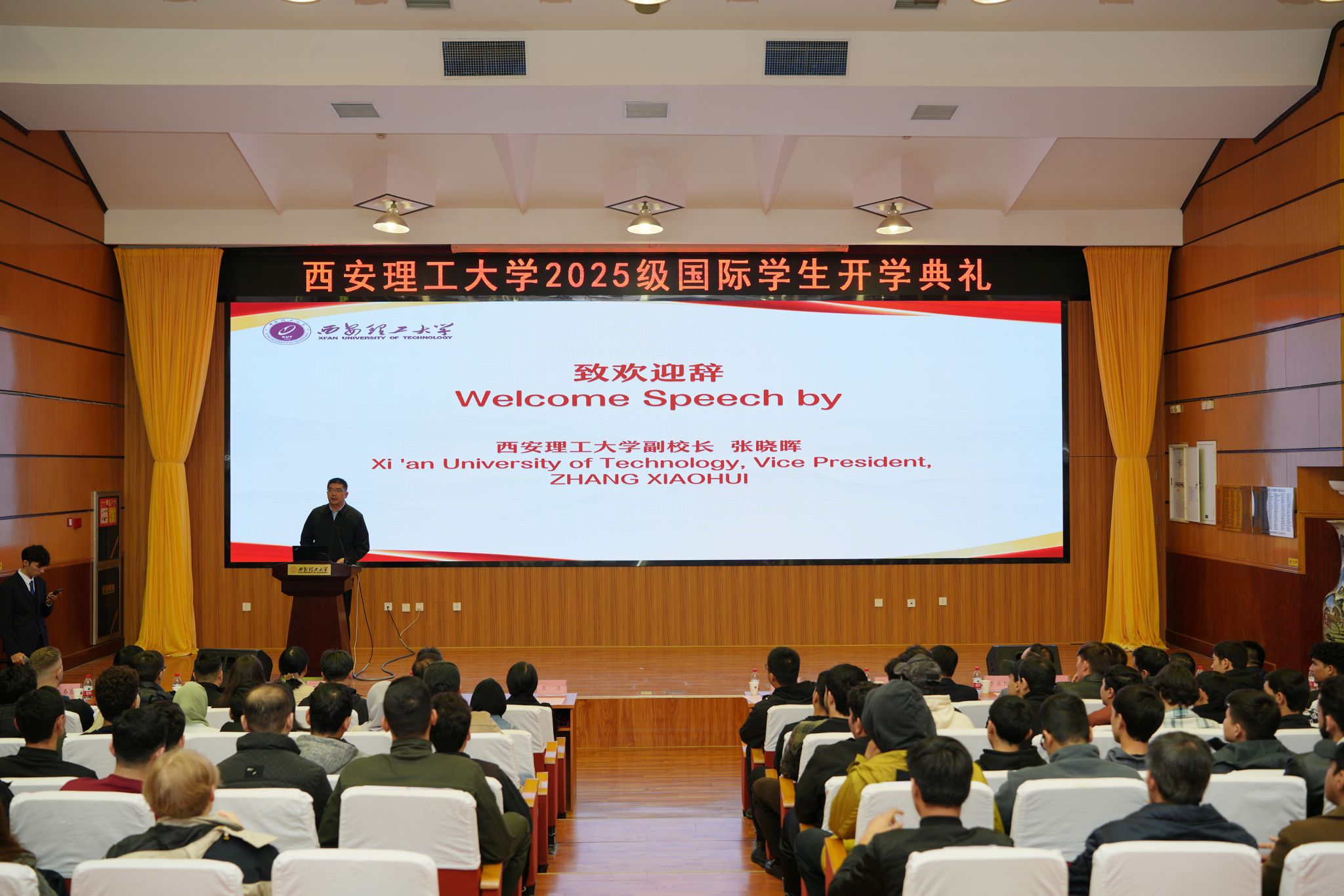 土木建筑工程学院书记刘峰、副书记王宗强、副院长胡义锋、郭宏超、薛海斌,人文与外国语学院院长张洁,水利水电学院副书记李永阳,计算机科学与工程学院副院长费蓉,电气工程学院副院长宋卫章,印刷包装与数字媒体学院副处级辅导员赵琦元,国际合作与交流处副处长蒋小龙,相关学院教师代表、在校国际学生,以及2025级全体国际学生等近200名师生参加典礼。