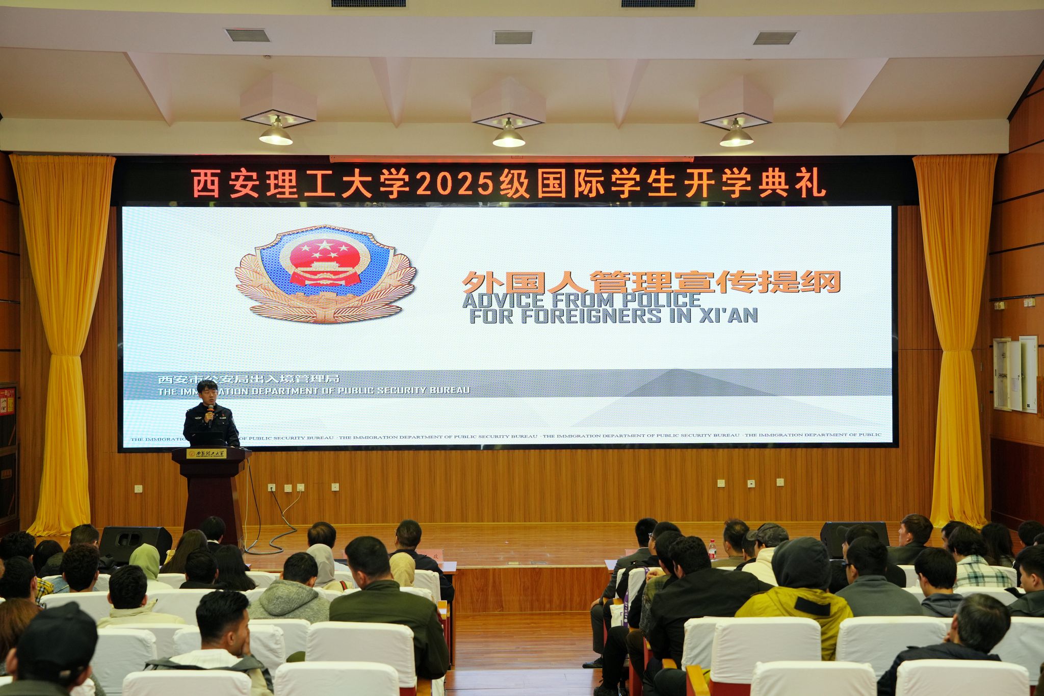为帮助新生尽快适应在华学习生活,典礼结束后,国际合作与交流处联合保卫处邀请西安市出入境管理局外管一大队大队长谭政、警官崔玖为全校国际学生举办了一场内容详实的法律法规教育宣讲会。两位警官着重讲解了与国际学生紧密相关的签证办理政策、在华停留居留的注意事项、中国交通法规以及日常行为规范等关键内容,还通过案例解析强调了遵守中国法律法规的重要意义,为国际学生在华安心学习、平安生活提供了明确指引。