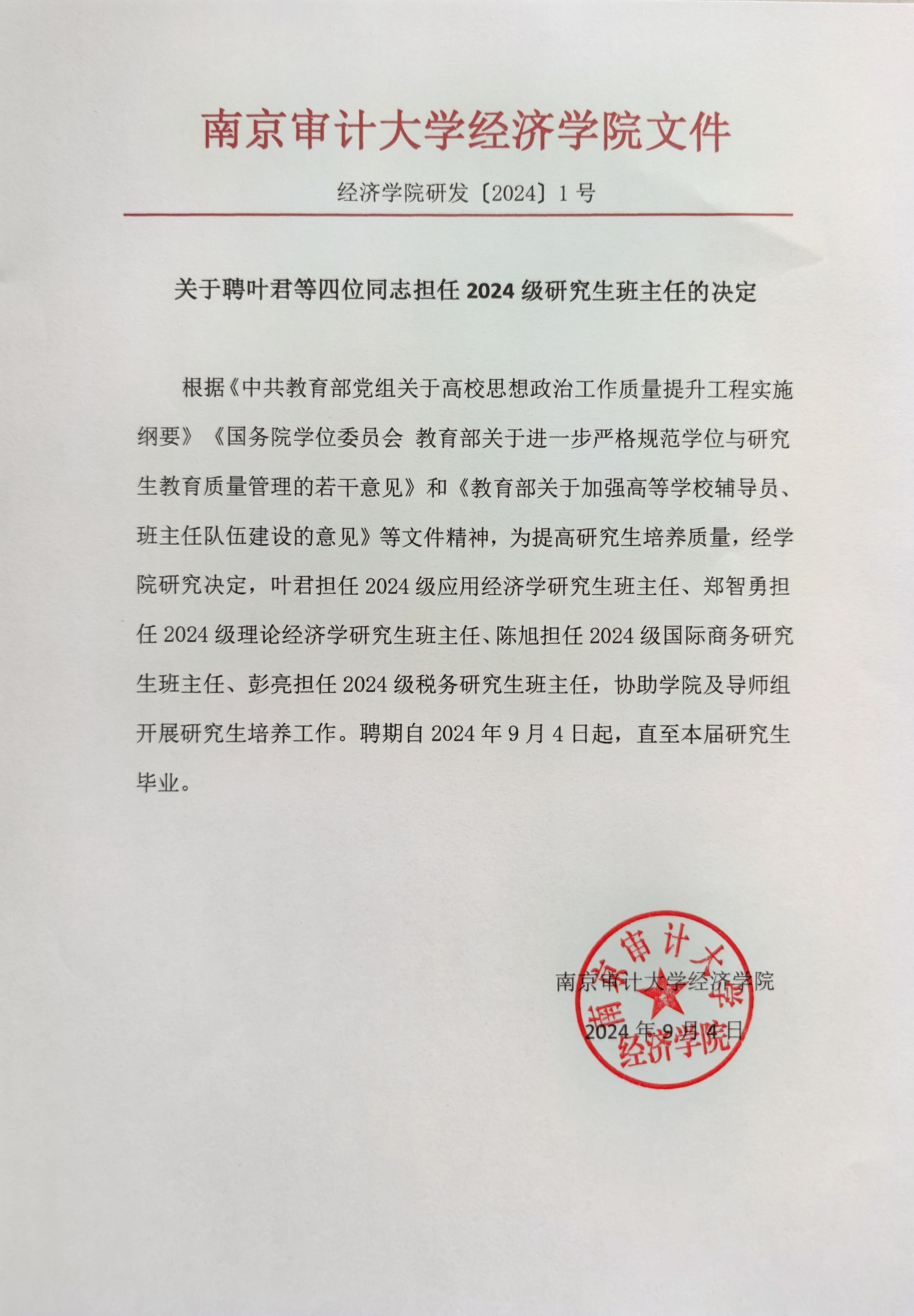 关于聘叶君等四位同志担任2024级研究生班主任的决定