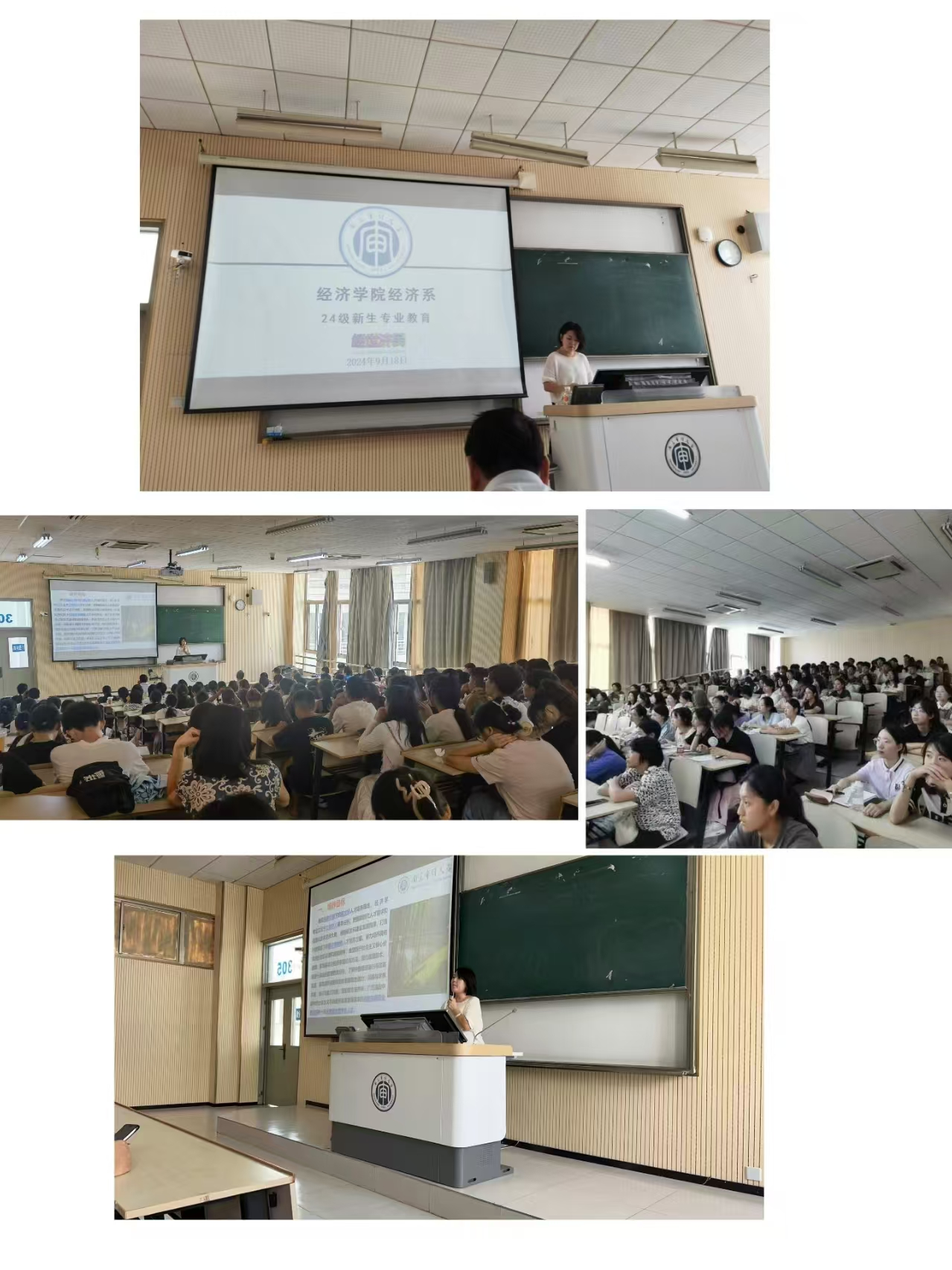 12:40,全体教师参加2024级经济学新生专业教育,系主任贺琳老师针对经济学专业人才培养从校情校史、专业简介、专业特色、人才培养方案解读、就业等五个方面给新生做了介绍;李想教授以“人无远虑必有近忧”、何以化“远虑”、何以解“近忧”为主题,为广大新生做了一场生动主题班会;之后经济系全体教师现场就学生提问的各个问题进行了解答,帮助同学们更快更好的适应、投入的大学的学习生活中。