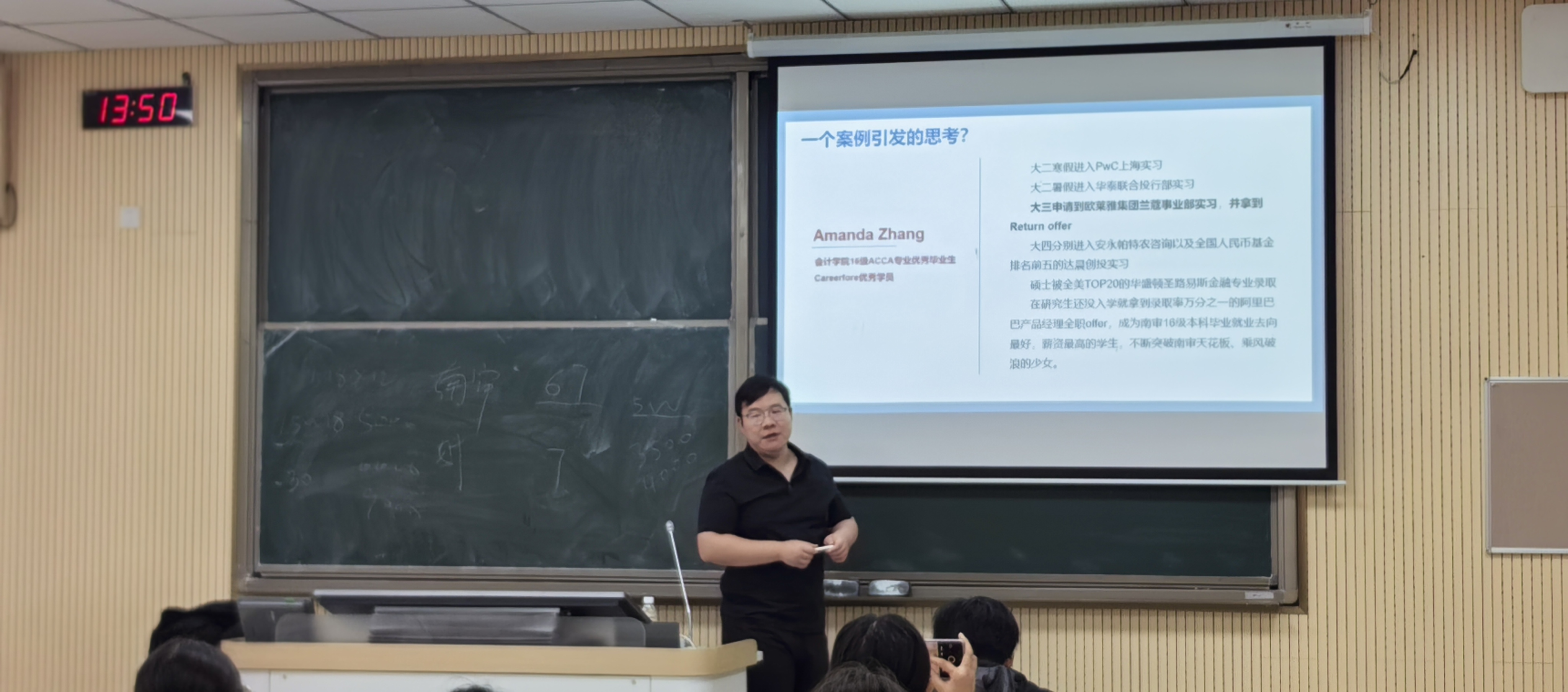 首先,吴政霖校友以五位南审优秀毕业生的成功案例为切入,阐述了南审平台的独特性与职业规划的重要性;其次,他从提前获取信息、迎合社会需求及提升思想觉悟等方面对经济学专业学生如何成功规划大学生活给出了具体建议;最后,他以一份南审优秀毕业生的简历内容为例,向同学们指出优异学业成绩、高质量实习和科学研究基础等要素,均可能成为未来求职过程中的重要亮点。在讲座过程中,吴政霖校友就同学们在经济学专业就业选择中的实际问题,进行了热烈而又亲切的交流指导。